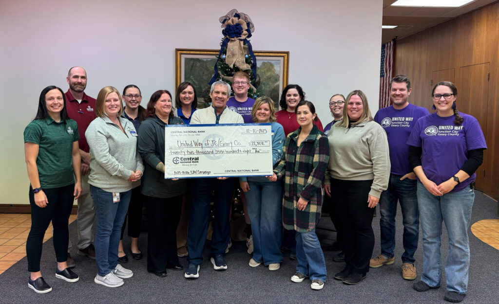 Junction City, Kansas: Central National Bank presented a check for $22,708 to the United Way of Junction City – Geary County in support of their 2026 Campaign. Central National Bank staff spent several weeks in October and November raising funds for United Way.